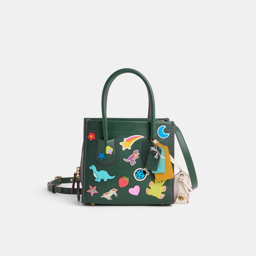 Playfully reimagined with loads of free-spirited Coach sticker patches bursting with color and fun by Rose Oliva, this structured style has been expertly cleaned, conditioned and restored. Our talented craftsperson Jose Reyna embellished the front, sides and back with salvaged Coach adhesive leather stickers, trimmed interior threads, then added a playful repurposed charm. Reimagined for today, this tote is based on the iconic "Cashin Carry" from 1969, a top-handle style by Coach's first lead designer, Bonnie Cashin. With three compartments for easy organization and space to hold an iPad mini, this compact 22 is crafted of glovetanned leather and natural pebble leather finished with a contrast edge for a pop of color. Carry by the top handles or attach the adjustable strap to wear on the shoulder or crossbody.