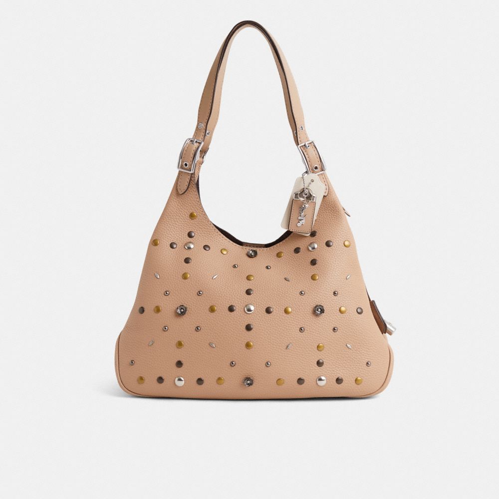 Reimagined by Eunice Chang with statement-making rivets in a mix of metals featuring gleaming Tea Roses, cone and prairie rivets, this spacious style has been expertly cleaned, conditioned and restored. Our talented craftspeople Ella Mulley and Nicole Izquierdo hand-decorated the front with a blend of polished studs, spot-painted the bottom, repaired threading on the interior compartment, applied a tender heart patch to the interior pocket, then added a playful repurposed charm. Part hobo, part carryall, our roomy Cass shoulder bag has space to hold everything you need and a secure center zip compartment. It's crafted of natural pebble leather with buttery soft glovetanned leather details and is finished with adjustable buckled straps.