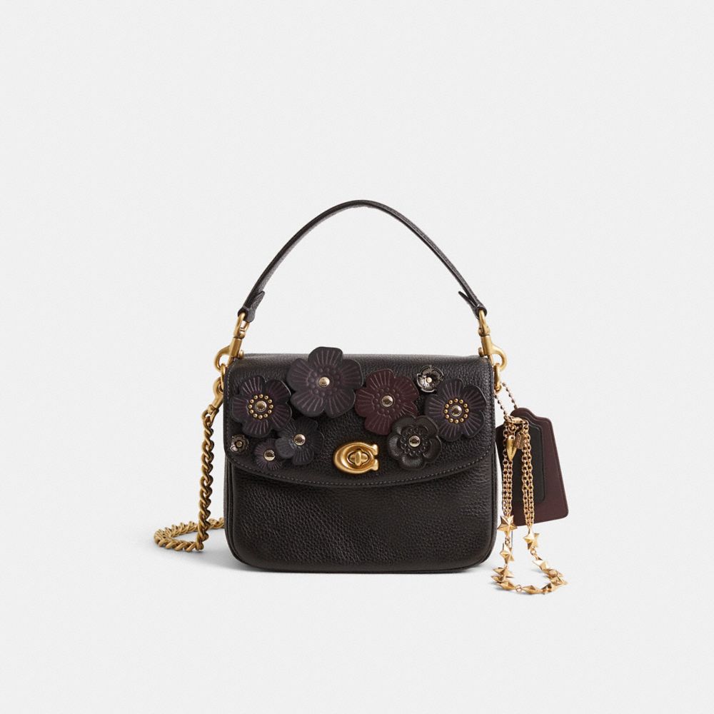 Reimagined by Ella Mulley with a moody mix of our dimensional Tea Rose appliqué accented with gleaming rivets, this flap-front style has been expertly cleaned, conditioned and restored. Our talented craftspeople Angel Penaloza, Nicole Izquierdo and Yngrid Pichardo Baez hand-decorated the flap with die-cut leather blooms and mini metal Tea Roses, repaired the threading and edgepaint on flap, refreshed the pocket, then added a playful repurposed charm. Our compact Cassie 19 is made for days or nights on the go. The polished pebble leather design is finished with a Signature turnlock closure and three interchangeable straps for versatile styling. Detach the crossbody strap and carry by hand with the leather and chain top handles together or separately.