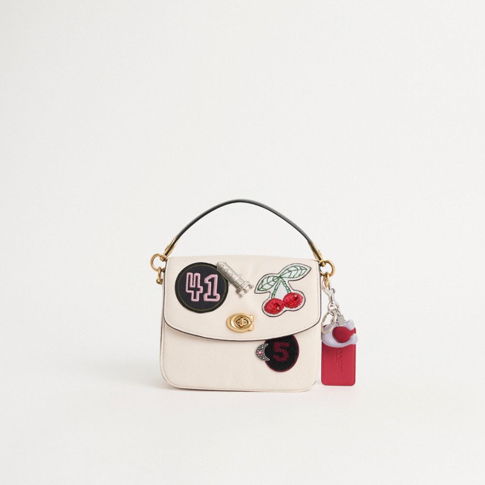 Reimagined with a whimsical Varsity vibe by Savannah Sutton featuring a medley of Coach patches and pins, this compact style has been expertly cleaned, conditioned and restored. Our talented craftspeople Nicole Izquierdo and Yngrid Pichardo Baez hand-decorated the flap and front with eclectic embellishments, then added repurposed short and long straps and a playful charm. Our Cassie 19 is made for days or nights on the go. The polished pebble leather design is finished with a Signature turnlock closure and three interchangeable straps for versatile styling. Detach the crossbody strap and carry by hand with the leather and chain top handles together or separately.