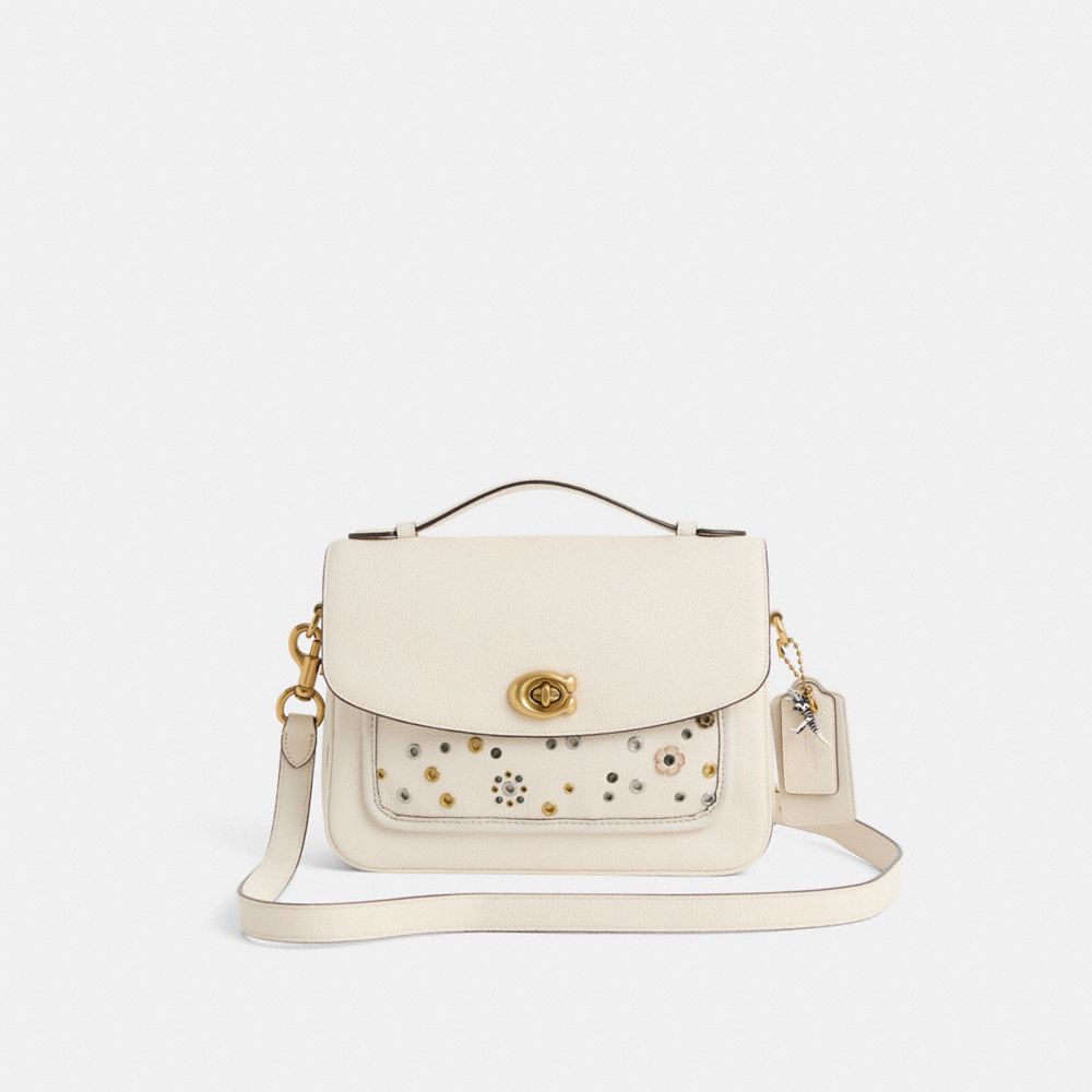 Reimagined with a convenient front pocket by Eunice Chang featuring a mix of industrial-inspired grommets and tiny metal Tea Roses, this flap-front style has been expertly cleaned, conditioned and restored. Our talented craftspeople Fernando Gutierrez and Yngrid Pichardo Baez attached a hardware-embellished leather pocket to the front, then added a playful repurposed charm. Our structured Cassie crossbody has ample room to hold everyday essentials with three organized compartments and space for an iPad mini. The polished pebble leather design is finished with an iconic turnlock closure. Detach the strap and carry by hand with the ladylike top handle.