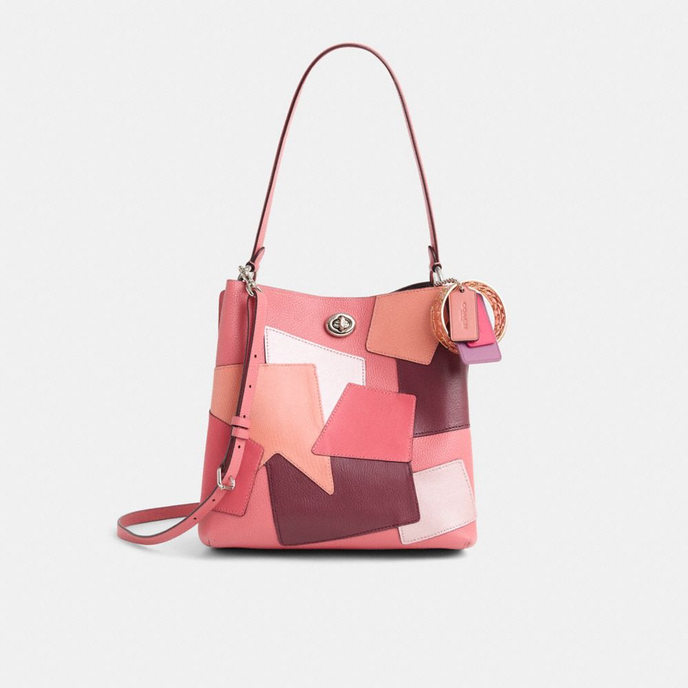 Reimagined with a vibrant mosaic patchwork by Rose Oliva featuring a mix of tonal leather hues, this medium-sized style has been expertly cleaned, conditioned and restored. Our talented craftspeople Fernando Gutierrez, Jose Reyna and Yngrid Pichardo Baez embellished the front with Coach remnant pieces, replaced O-ring hardware and added a playful repurposed charm. Our Charlie Bucket Bag is spacious in design and lightweight in feel. This polished pebble leather carryall features two organized compartments and an interior multifunction pocket to hold everyday essentials. It secures with a turnlock closure and can be carried by hand, slung on the shoulder or worn hands-free as a crossbody.