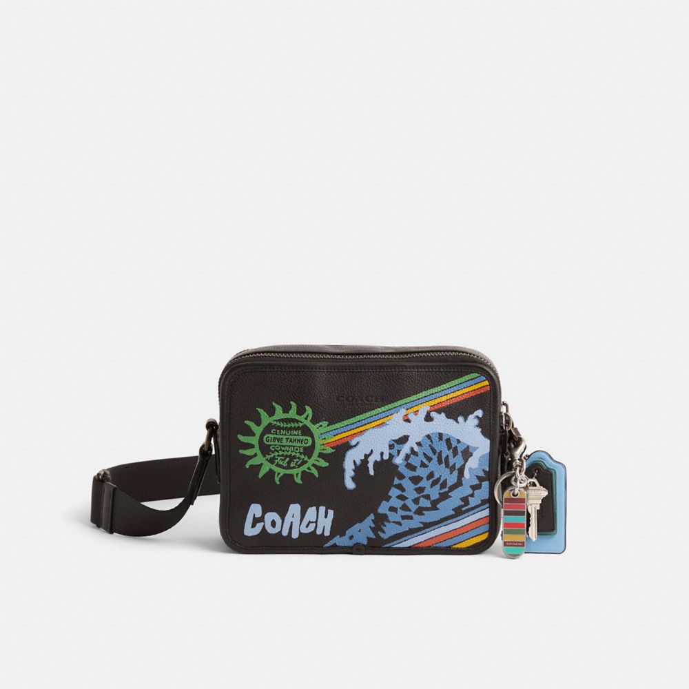 Reimagined by Rose Oliva with an abstract wave graphic featuring a whimsical take on Coach iconography and California surf culture vibrantly hand-painted by Jose Reyna, this structured style has been expertly cleaned, conditioned and restored. Our talented craftsperson Jose Reyna spot-painted the binding, refreshed zipper tape and interior, replaced the mini D-ring, then added a playful repurposed charm. For adventures near and far, our Charter is designed to make every journey, commute and errand feel like a first-class experience. Crafted of polished pebble leather with refined leather details, our Charter crossbody has two zip compartments and a lightweight adjustable webbing strap for versatile wear.