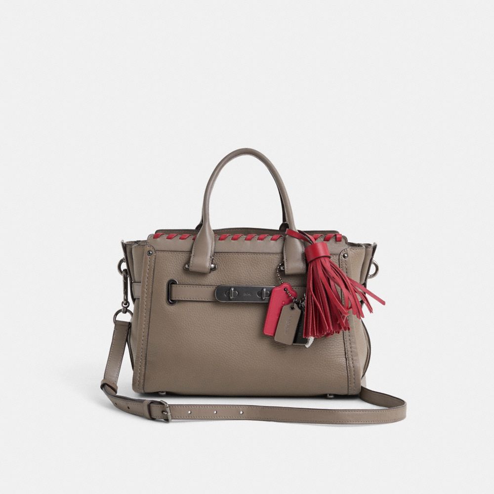 Pre-owned and now (re)loved, this Coach Swagger 27 is a very special Coach upcrafted design inspired by our commitment to rethinking and reducing our impact on the planet. Saved from the landfill, this gently-worn bag was lovingly repaired and transformed by our in-house craftspeople who added clever details to give it a second life. It’s completely one-of-a-kind, and comes with its own unique set of charms. Wear it, love it, pass it on.