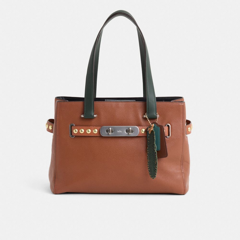 Reimagined by Eunice Chang with a bold pop of color and gleaming rivets for a striking finish, this carry-it-all style has been expertly cleaned, conditioned and restored. Our talented craftsperson Nicole Izquierdo replaced the straps with leafy green ones, hand-decorated the front with golden studs, refreshed the edgestain, replaced the turnlock closure, spot-painted the bottom and magnet lining, then added a playful repurposed charm. Subtle colorblocking gives this Coach Swagger carryall a sophisticated graphic look. Crafted of polished pebble leather with a sumptuous grain, this carryall functions a bit like a tote, with longer handles for shoulder wear and a magnetic snap closure for security.