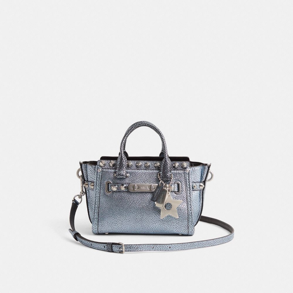 Reimagined with dramatic border rivets for an edgy vibe by Eunice Chang, this streamlined style has been expertly cleaned, conditioned and restored. Our talented craftsperson Lucas Ortiz hand-decorated the topline and front strap with conical-shaped studs, repaired threading on gusset and added a playful repurposed charm. Statement belting with double-turnlock hardware adds "swagger" to a simple shape inspired by archival Coach designs. Crafted of refined metallic pebble leather and finished by hand, the petite 20 has an outside slip pocket for easy access to essentials.
