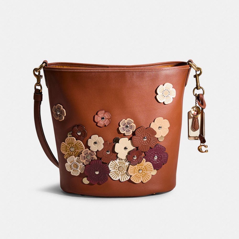 Reimagined by Rose Oliva with a medley of dimensional Tea Roses brimming with rich dreamy color and striking Coach rivets, this relaxed style has been expertly cleaned, conditioned and restored. Our talented craftsperson Alfred Deaza embellished the front with die-cut leather blooms and added a playful repurposed charm. Based on an iconic archival Coach style, our Dakota bucket bag is the epitome of laid-back sophistication. The buttery soft glovetanned leather style has a spacious interior and is finished with two detachable straps to carry by hand, style as a short shoulder bag or wear crossbody.