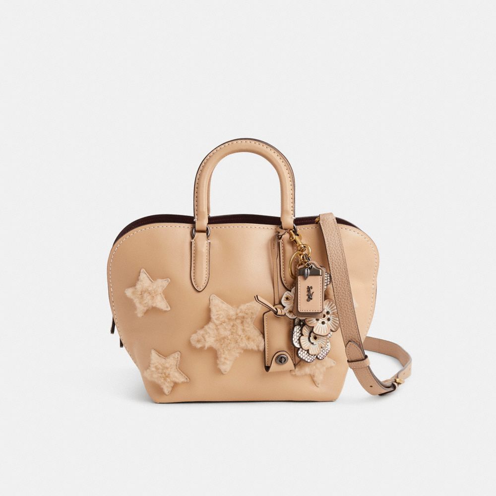 Reimagined with a star-making attitude by Eunice Chang featuring a motif in luxuriously soft shearling, this top-handle style has been expertly cleaned, conditioned and restored. Our talented craftspeople Jose Reyna and Fernando Gutierrez hand-decorated the front with tonal shearling star appliqué, replaced the long strap, spot-painted the exterior and interior, then added a playful repurposed charm. A curved shape based on 1960s bowling bags, the Dakotah is crafted of Coach glovetanned leather and features a center-zip and two exterior pockets for easy access to essentials.