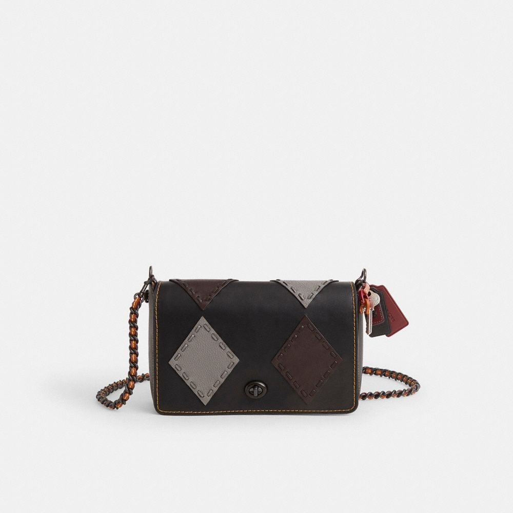 Reimagined with a sophisticated two-tone argyle patchwork by Eunice Chang and Rose Oliva detailed with tonal pick-stitching, this foldover style has been expertly cleaned, conditioned and restored. Our talented craftspeople Jose Reyna, Alfred Deaza and Kendry Almonte de Torres hand-decorated the newly replaced flap with Coach remnant materials, repaired its edgestain and applied heart patches to the underside, replaced the turnlock and added a playful repurposed charm. The Dinky puts a modern spin on an iconic 1974 Coach design. With a nostalgic look toward the past, this re-edition comes with a leather-and-chain strap and an attached French purse inside, an archival element first introduced by Bonnie Cashin.
