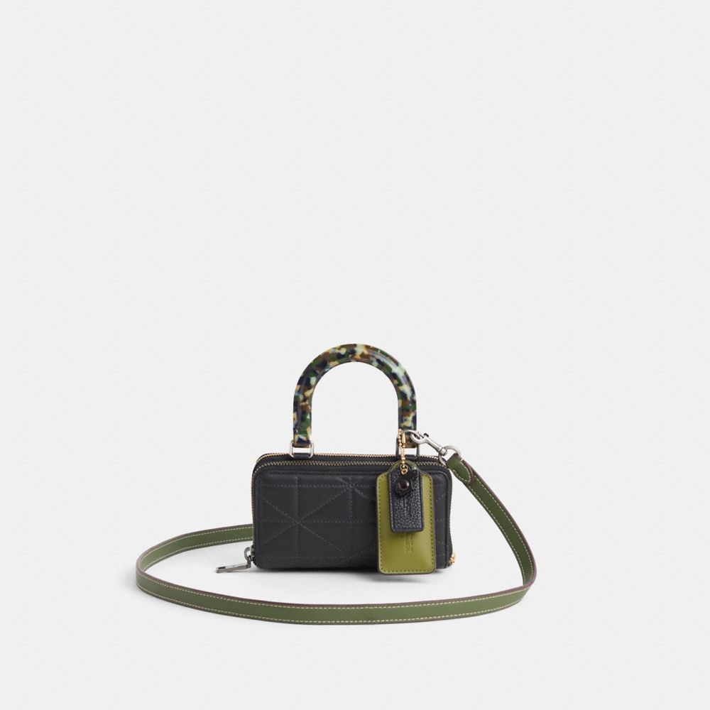Reimagined as a cool top handle and crossbody design by Savannah Sutton with double the space and double the organization, this hybrid style has been expertly cleaned, conditioned and restored. Our talented craftspeople Nicole Izquierdo, Alfred Deaza and Yngrid Pichardo Baez sewed two wallets back-to-back, attached anchors, repaired interior threads, then added a marbleized camo-print top handle, a long leather strap and a playful repurposed charm. Secured by a zippered closure, the quilted smooth leather wallet has dedicated space for your phone, cards, cash and coins, while the crossgrain leather zip wallet has ten card slots, a full-length bill compartment and a zip coin pocket.