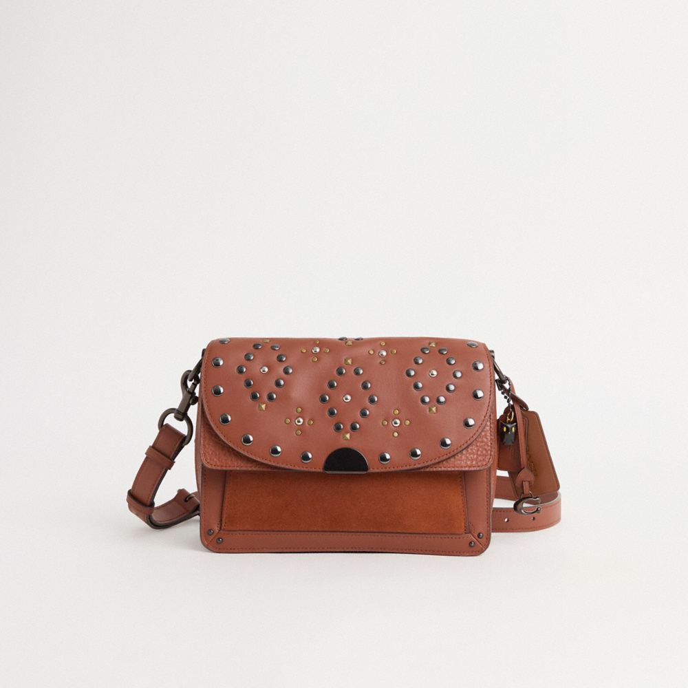 Reimagined with a fun Western attitude by Eunice Chang featuring striking mixed-metal studs and golden pyramid rivets, this take-everywhere style has been expertly cleaned, conditioned and restored. Our talented craftsperson Nicole Izquierdo embellished the flap with polished hardware, then added a gleaming chain strap and a playful repurposed charm. The Dreamer is inspired by the endless possibilities of New York City. Crafted in a cool mix of leathers and soft suede, this organized flap-front bag features a center zip compartment, two open sections, an outside slip pocket, modern hardware and a Signature charm. It's finished with a detachable leather strap and a detachable chain strap to swap out for two different looks.