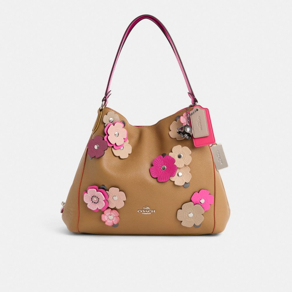 Reimagined with a pretty-in pink color pop and clusters of our dimensional Tea Rose appliqué by Savannah Sutton, this slouchy style has been expertly cleaned, conditioned and restored. Our talented craftsperson Nicole Izquierdo hand-decorated the front with die-cut leather blooms and gleaming peek-a-boo rivets, replaced the handles with pop color ones, painted the corners, interior leather and zipper pull, repaired stitching, then added a playful repurposed charm. Hand-stained contrast edging adds definition and a pop of color to the easy and elegant Edie. Crafted of polished pebble leather, this soft silhouette conceals three compartments that offer the ultimate in organization.