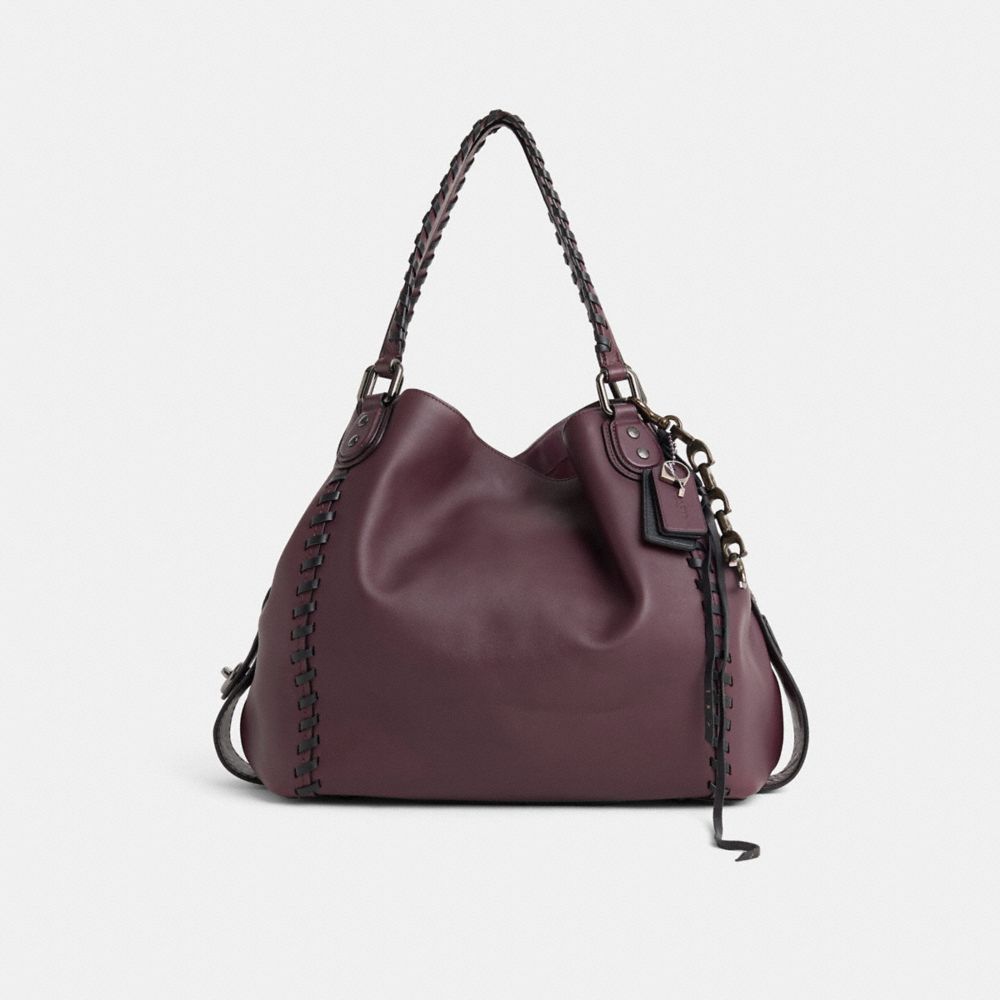 Reimagined by Rose Oliva with dramatic hand-laced whipstitching for rich depth and artisanal dimension, this relaxed style has been expertly cleaned, conditioned and restored. Our talented craftspeople Fernando Gutierrez, Nicole Izquierdo and Jose Reyna embellished the handles and exposed front seaming with sleek whipstitching, spot-painted the corners, base and handles, then added a playful repurposed charm. Edie combines downtown ease with utility. The soft, slouchy glovetanned leather silhouette of the extra-spacious 42 conceals a three-compartment interior designed for perfect organization.