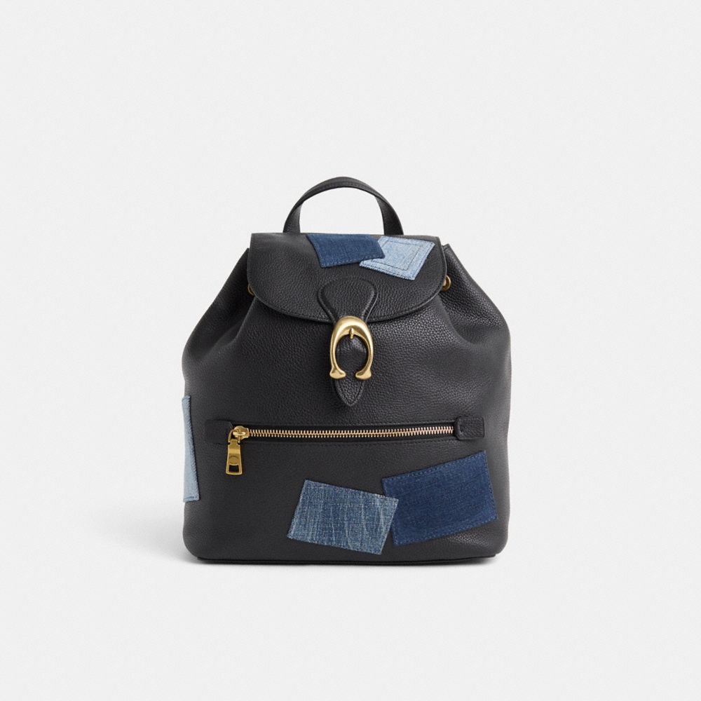 Reimagined with a casual-cool vibe by Rose Oliva featuring a dynamic denim patchwork in light-to-dark washes and hues, this sporty style has been expertly cleaned, conditioned and restored. Our talented craftspeople Fernando Gutierrez, Alfred Deaza and Yngrid Pichardo Baez embellished the flap and front with a selection of Coach denim remnants, repaired drawstring threads, refreshed edgestain strap, then added a playful repurposed charm. Our Evie backpack is crafted of scratch-resistant polished pebble leather. The exterior pocket offers easy access to phone, earbuds and more, while interior multifunction pockets and cinched drawstring closure keep essentials organized and secure. Finished with a convenient top handle, our Signature hardware accents the external snap closure for an iconic Coach touch.