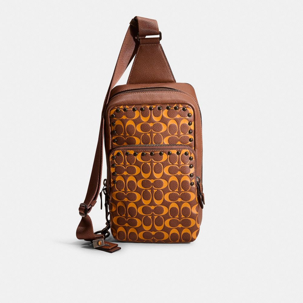 Reimagined by Eunice Chang with gleaming border rivets for a punctuated finish, this hands-free style has been expertly cleaned, conditioned and restored. Our talented craftsperson Jose Reyna hand-decorated the front with polished studs, spot-painted the tabs, then added a playful repurposed charm. A bag as distinct as its namesake city, the Gotham is a sleek, streamlined style that means business. Crafted of our Signature polished pebble leather featuring a bold color combo, the sleek Pack has two exterior zip pockets for easy organization and an open interior with room for an iPad and more. Wear it on the shoulder or crossbody with the adjustable strap.