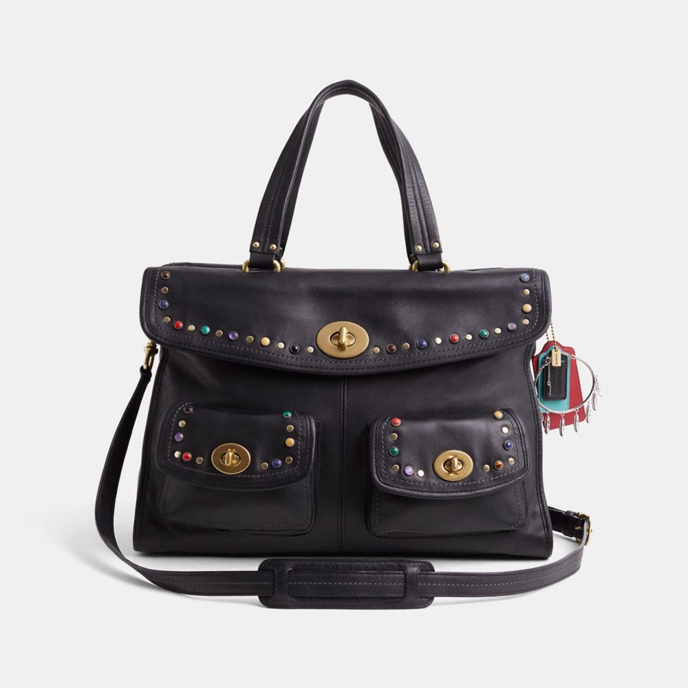 Reimagined with striking border rivet detailing by Rose Oliva featuring gleaming border studs and colorful cabochons, this flap-front style has been expertly cleaned, conditioned and restored. Our talented craftspeople Alex Lodato and Yngrid Pichardo Baez embellished the flap and outside pockets with eclectic embellishments, replaced the turnlocks, repaired threads at bottom, polished the D-rings, spot-painted the binding and added a playful repurposed charm. The Hamptons is a spacious business bag crafted of rich, smooth leather. Designed with two outside pockets and multifunctional inside pockets, it secures with turnlock closures.