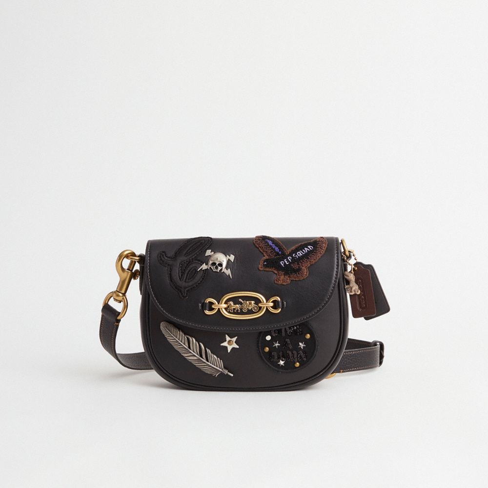 Reimagined with an edgy-cool vibe by Eunice Chang featuring a medley of Coach patches and pins, this saddle design has been expertly cleaned, conditioned and restored. Our talented craftsperson Nicole Izquierdo hand-decorated the front with eclectic embellishments, then added a repurposed short strap and playful charm. Crafted of buttery soft glovetanned leather, this saddle crossbody has an adjustable strap and pockets inside and out for easy organization. Featuring a certified organic cotton lining, the flap-front style is accented with our iconic polished Horse and Carriage hardware.