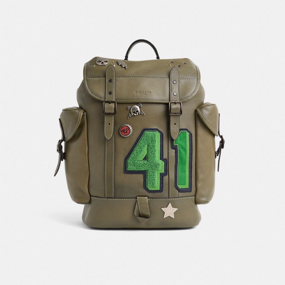 Reimagined with distinctive Coach embellishments for a sporty Varsity vibe by Rose Oliva, this hands-free style has been expertly cleaned, conditioned and restored. Our talented craftspeople Fernando Gutierrez and Yngrid Pichardo Baez hand-decorated the flap and front with distinctive patches and pins featuring our founding year, applied rivets to the interior, then added a playful repurposed charm. Combining effortless style and major functionality, our Hitch takes you to work, weekends and everywhere in between. Crafted of soft sport refined leather, this organized backpack has space for a 15" laptop, interior multifunction pockets to hold small accessories, and exterior side pockets for easy access to essentials. It’s a comfortable lightweight style with a durable microfiber lining and spacer mesh backing.
