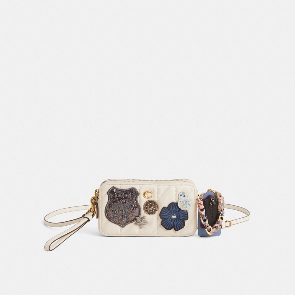 COACH®,Upcrafted Kira Crossbody,Leather,Crossbody,Wristlet,Metal,Rhinestones,Studded,Logo,Applique,Chain Detail,Gold Metal...,Cream,Angle View