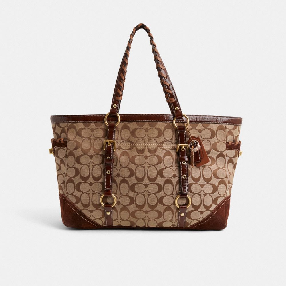 Reimagined by Rose Oliva with tonal hand-laced whipstitching for rich dimension and an artisanal finish, this carry-it-all style has been expertly cleaned, conditioned and restored. Our talented craftsperson Yngrid Pichardo Baez embellished the topline and handles with sleek whipstitching, polished the rivets, turnlocks and zipper, repaired the edgestain, then added a playful repurposed charm. Our large Gallery tote is uniquely crafted of Signature jacquard fabric with leather trim. This spacious carryall secures with a zip-top closure and features multifunction pockets inside and out.