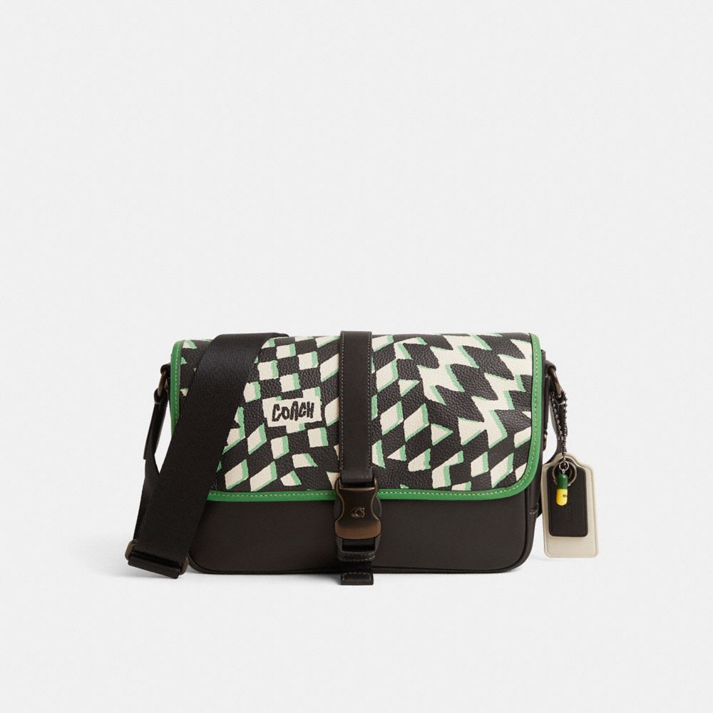 Reimagined by Eunice Chang with a hypnotic op art graphic motif on the flap inspired by vintage surfboards, this hands-free style has been expertly cleaned, conditioned and restored. Our talented craftspeople Fernando Gutierrez and Yngrid Pichardo Baez incorporated an animated geometric remnant on the flap, applied green leather binding to the flap and back, replaced the back pocket, refreshed the gusset and added a playful repurposed charm. Our streamlined League messenger bag, crafted of smooth leather has an open interior compartment with room for a tablet, multifunction pockets for organizing gadgets and an exterior pocket for essentials. It’s finished with our Signature speedclip closure and an adjustable strap for hands-free convenience.