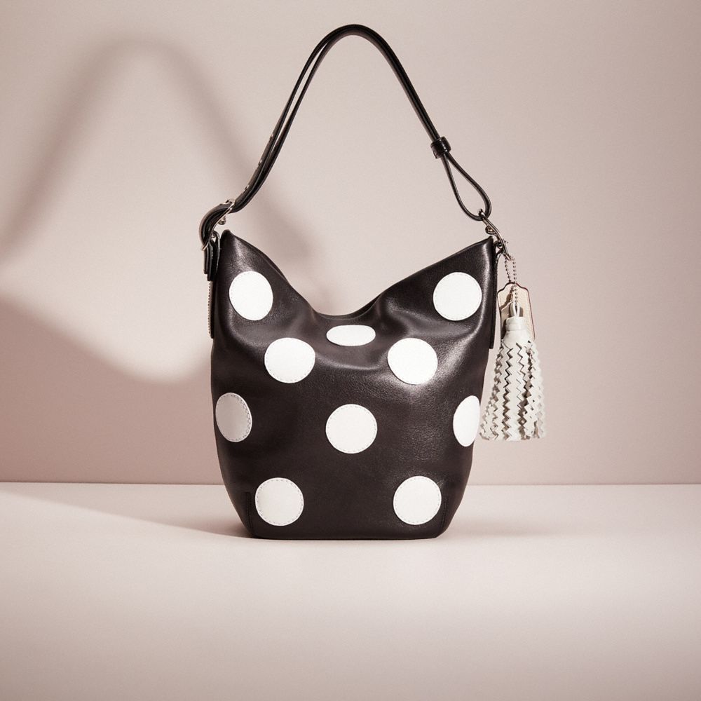 Reimagined by Eunice Chang featuring a spot-on playful polka dot motif, this take-everywhere style has been expertly cleaned, conditioned and restored. Our talented craftspeople Antonio Hernandez and Jose Reyna hand-decorated it with a domino dot design, replaced the zipper pull and added a playful repurposed charm. Inspired by the downtown New York City neighborhood, our rich leather Soho bucket bag has a roomy interior and features interior multifunction pockets and a zip-top closure.