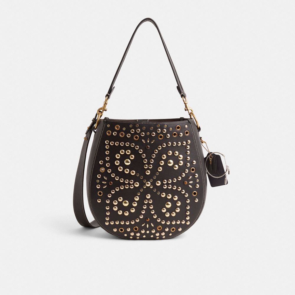 Reimagined by Rose Oliva with a cool Western-inspired bandana print motif featuring an intricate mix of colorful cabochons, prairie rivets and golden studs, this hobo style has been expertly cleaned, conditioned and restored. Our talented craftspeople Alex Lodato and Kendry Almonte de Torres embellished the front with gleaming rivets, polished the exterior, repaired threads on magnetic tab, replaced the shoulder strap, then added a zip pouch and playful repurposed charm. Our Maddy is crafted of our buttery soft glovetanned leather and features an open interior plus a removable zip pouch to organize small essentials. Carry it by hand, on the shoulder or wear hands-free as a crossbody with the detachable strap.