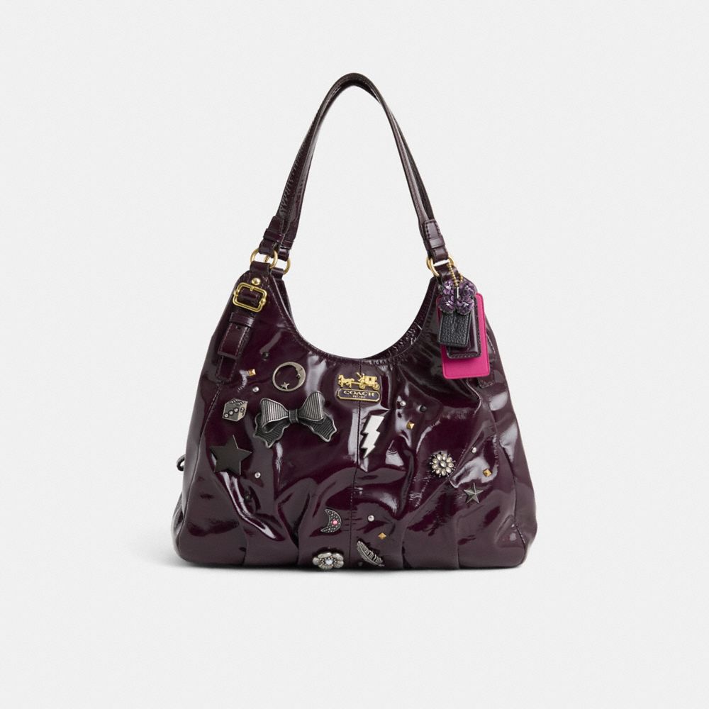 Reimagined with an opulent jewelry-inspired motif by Rose Oliva featuring a scattering of gleaming sweet pins and polished rivets, this relaxed style has been expertly cleaned, conditioned and restored. Our talented craftspeople Fernando Gutierrez, Yngrid Pichardo Baez and Michelle Barquet hand-decorated the front with an elaborate selection of striking embellishments, repaired the edgestain on side tabs and straps, then added a playful repurposed charm. Our Madison Maggie hobo bag has a zip-top center compartment with multifunction pockets and two outer compartments. This versatile carryall is crafted of shiny patent leather and has an exterior pocket for easy access to small essentials.