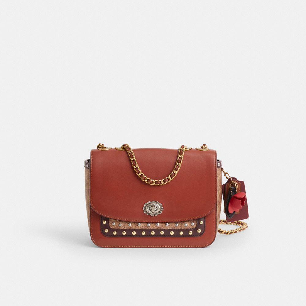 Reimagined with a Western attitude by Rose Oliva featuring a concho-inspired turnlock and graduated border rivets, this flap-front style has been expertly cleaned, conditioned and restored. Our talented craftspeople Angel Penaloza, Antonio Hernandez and Kendry Almonte de Torres embellished the front with mixed-metal studs, incorporated a pop leather overlay to the outside pocket, polished the chain strap, eyelets and hangtag D-ring, repaired back pocket lining, spot-painted the D-ring loop, applied leather tabs to top of gussets, then added a concho turnlock and a playful repurposed charm. The Madison is a timeless style with modern proportions. Crafted of refined leather and our Signature canvas, it's finished with an exterior pocket for easy access to essentials and a turnlock closure. Convert the leather chain strap from long to two short handles.