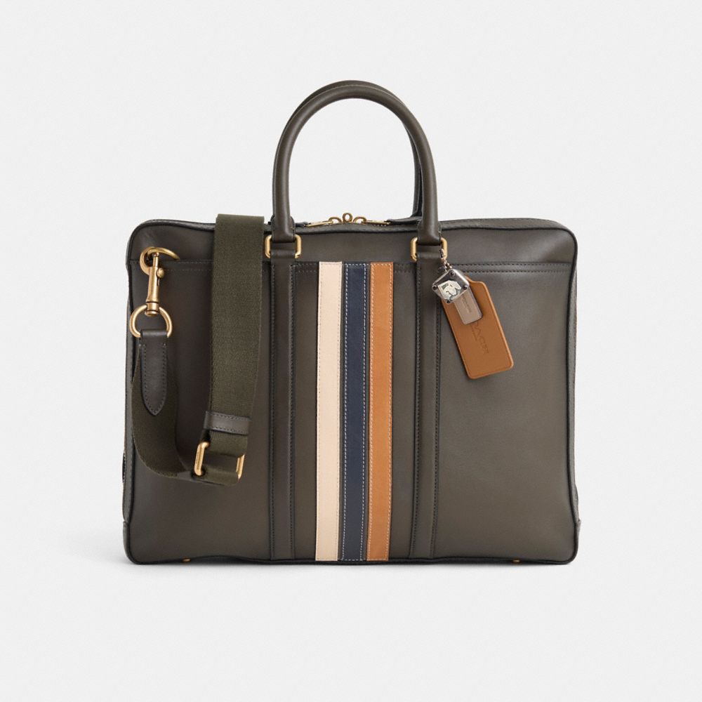 Reimagined by Macshella Oduro with a sporty vibe featuring our Varsity Stripe in a trio of bold, contrasting hues, this hold-everything style has been expertly cleaned, conditioned and restored. Our talented craftspeople Jose Reyna and Yngrid Pichardo Baez embellished the front with a Coach Varsity Stripe, spot-painted the magnetic closure and added a playful repurposed charm. The Metropolitan is a no-fuss brief made for the modern man. Crafted of our glovetanned leather, this lightweight, streamlined bag is designed with multifunctional pockets and an interior sleeve that holds a 15" laptop.