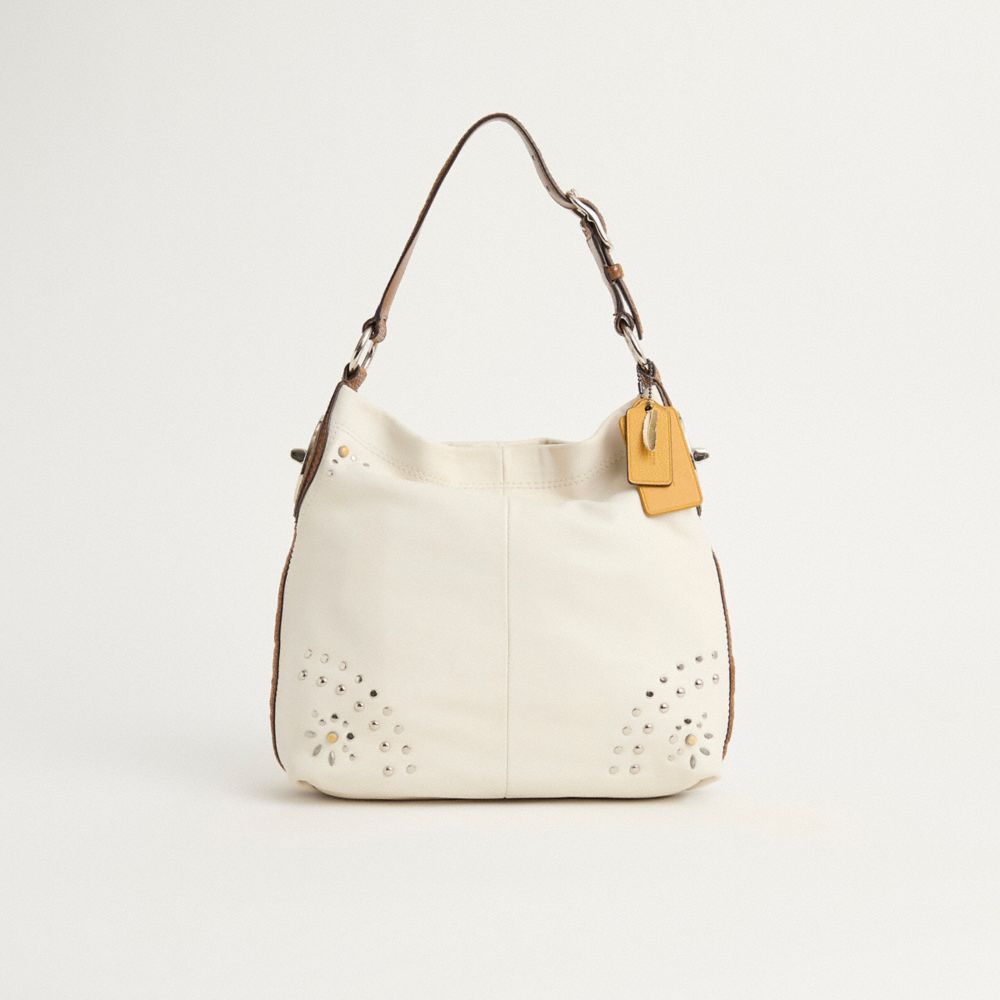Reimagined by Savannah Sutton with striking rivet detailing featuring silvery studs and colorful cabochons for a fun Western vibe, this roomy style has been expertly cleaned, conditioned and restored. Our talented craftsperson Jose Reyna hand-decorated the top and bottom corners with polished hardware and added a playful repurposed charm. The Penelope is a sophisticated spacious shoulder bag crafted of soft leather. Detailed with our iconic turnlock closure hardware at the straps, interior multifunction pockets hold all of your essentials.