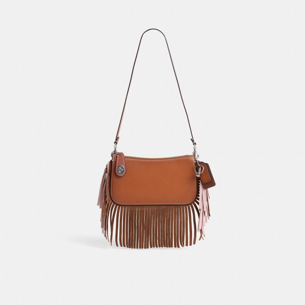 Reimagined with a bohemian-inspired vibe by Eunice Chang featuring layers of dense two-tone fringe for a swingy finish, this slim style has been expertly cleaned, conditioned and restored. Our talented craftspeople Jose Reyna, Alfred Deaza and Yngrid Pichardo Baez attached statement-making leather fringe along the edges, repaired the zipper tape, then added a zipper pull, slider and a playful repurposed charm. Inspired by archival Coach Y2K designs but perfected for today, our Penn bag is effortlessly minimalist. Finished with our iconic turnlock closure on the zipper pull, the buttery soft glovetanned leather style can be worn on the shoulder or carried as a clutch.