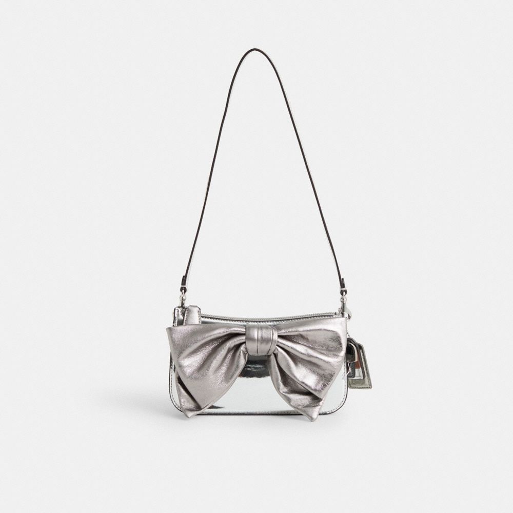 Reimagined with the perfect finishing touch by Rose Oliva featuring a luxe oversized leather bow, this compact style has been expertly cleaned, conditioned and restored. Our talented craftspeople Jose Reyna, Alfred Deaza and Yngrid Pichardo Baez embellished the front with a tonal leather bow, hand-decorated the back with a smattering of exotic snakeskin and leather Tea Rose appliqué, remade the zipper pull in grey leather, then added a playful repurposed charm. Inspired by archival Coach Y2K designs but perfected for today, our slim Penn bag is effortlessly minimalist. Finished with our iconic turnlock closure on the zipper pull, the lustrous mirror metallic leather style can be worn on the shoulder or carried as a clutch.