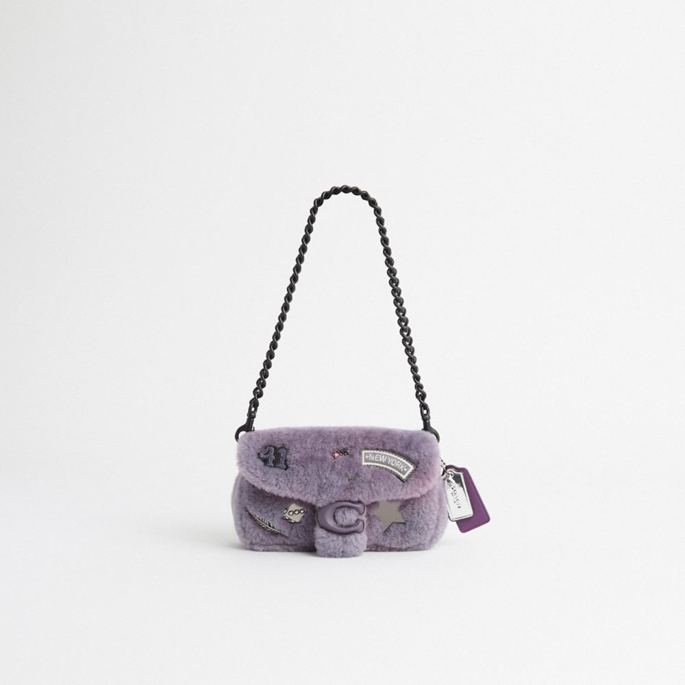 Reimagined with a fun Varsity vibe by Eunice Chang featuring loads of whimsical Coach patches and pins, this flap-front style has been expertly cleaned, conditioned and restored. Our talented craftsperson Jose Reyna hand-decorated the front with favorite embellishments, then added a repurposed short strap, long strap and playful charm. The Pillow Tabby reimagines the structured silhouette of an archival 1970s Coach design with supersoft plush dyed short-haired shearling and leather wrapped Signature hardware. The petite 18 is a cozy-luxe style featuring two detachable straps to carry by hand, style as a shoulder bag or wear crossbody.