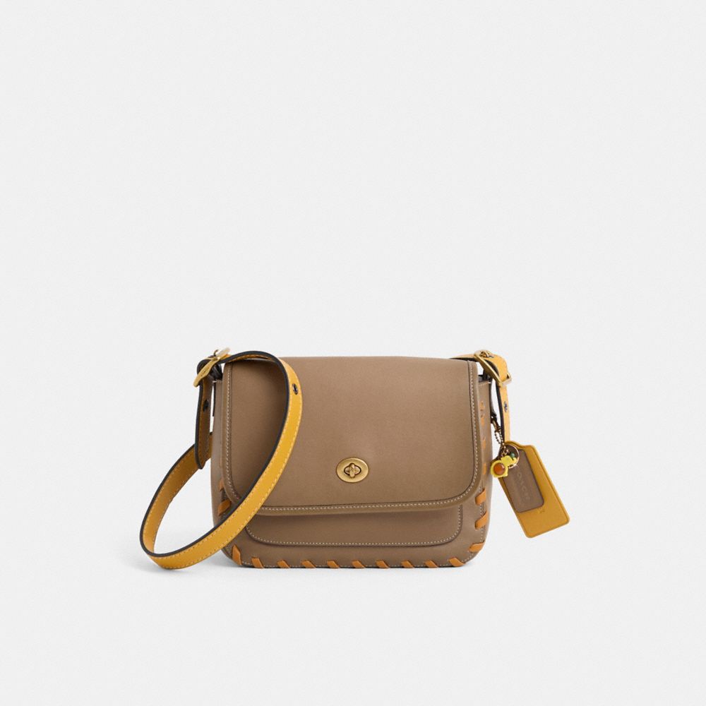 Reimagined with a crisp graphic edge by Savannah Sutton featuring sleek hand-laced whipstitching, this flap-front style has been expertly cleaned, conditioned and restored. Our talented craftspeople Jose Reyna and Yngrid Pichardo Baez outlined the front in rich whipstitching, replaced the turnlock and buckles, painted the side tabs, then added a long yellow strap and a playful repurposed charm. A modern nod to an iconic 1967 Coach collection, this Rambler crossbody is crafted of glovetanned leather and is finished with our iconic turnlock closure. The open compartment design has space for an iPad mini, interior pockets to secure valuables, convenient exterior slip pockets and an adjustable strap to wear on the shoulder or crossbody.