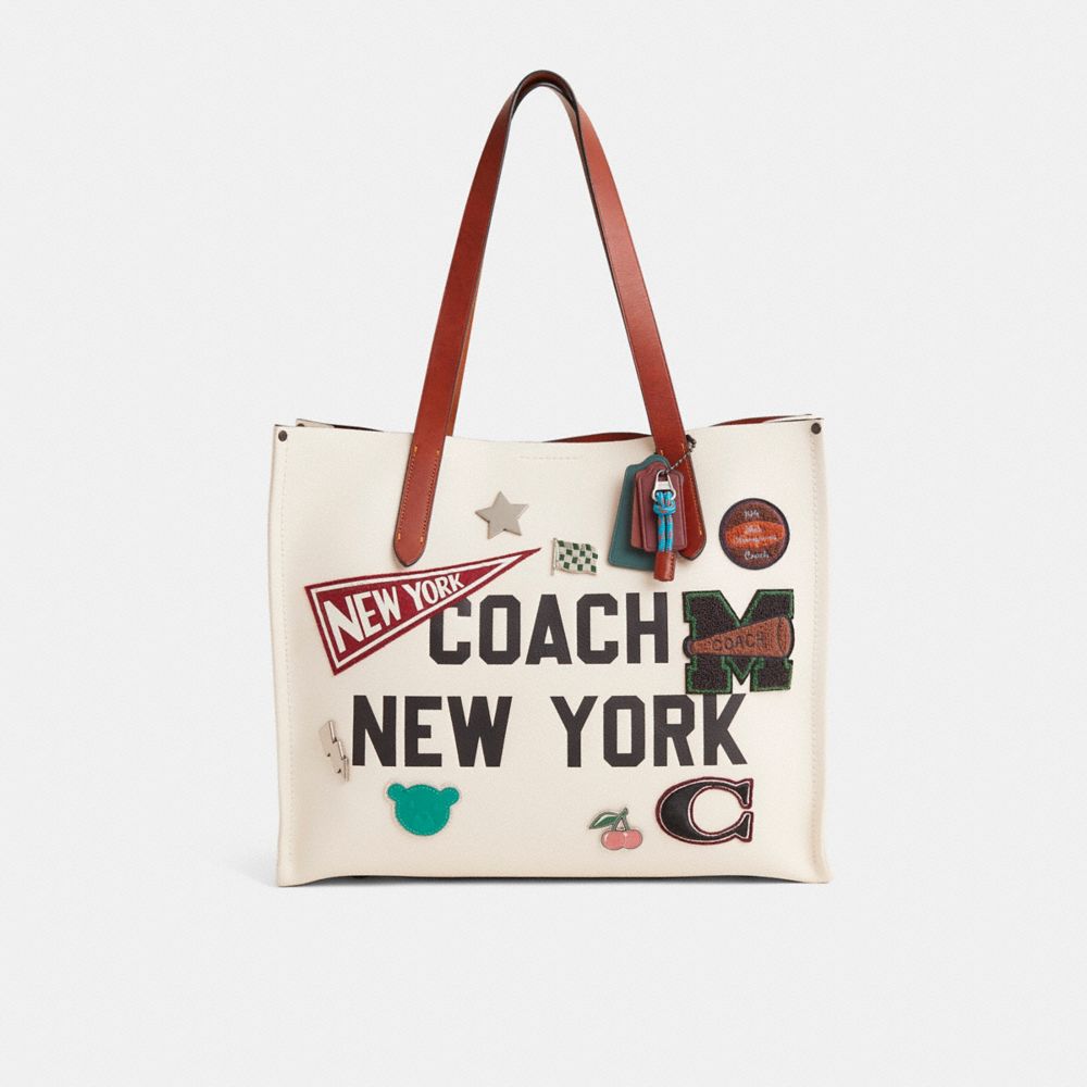 Reimagined with distinctive Coach embellishments for a sporty Varsity vibe by Rose Oliva, this spacious style has been expertly cleaned, conditioned and restored. Our talented craftsperson Eduardo Zhunes hand-decorated the front with dynamic patches and pins, spot-painted the letters, repaired the edgestain on handle, then added a playful repurposed charm. The roomy Relay tote has room to hold work, workout or weekend gear with space for a 16" laptop and an interior zip Signature canvas pocket to organize essentials. Crafted of polished pebble leather featuring our Coach graphic, it secures with a magnetic snap closure.