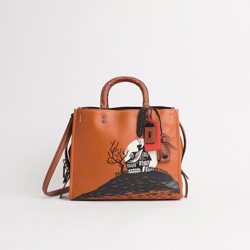 Reimagined with a charmingly spooky Halloween vibe by Rose Oliva featuring a frightful retro-inspired haunted house graphic intricately hand-painted by Jose Reyna, this roomy style has been expertly cleaned, conditioned and restored. Reyna spot-painted the corners, repaired gusset threads and edgepaint, then added a long strap and a playful repurposed charm. Inspired by free spirits, rebels and dreamers, the aptly named Rogue is a go-anywhere bag. Finished with genuine crocodile details, it's crafted in a mix of natural pebble leather and glovetanned leather.