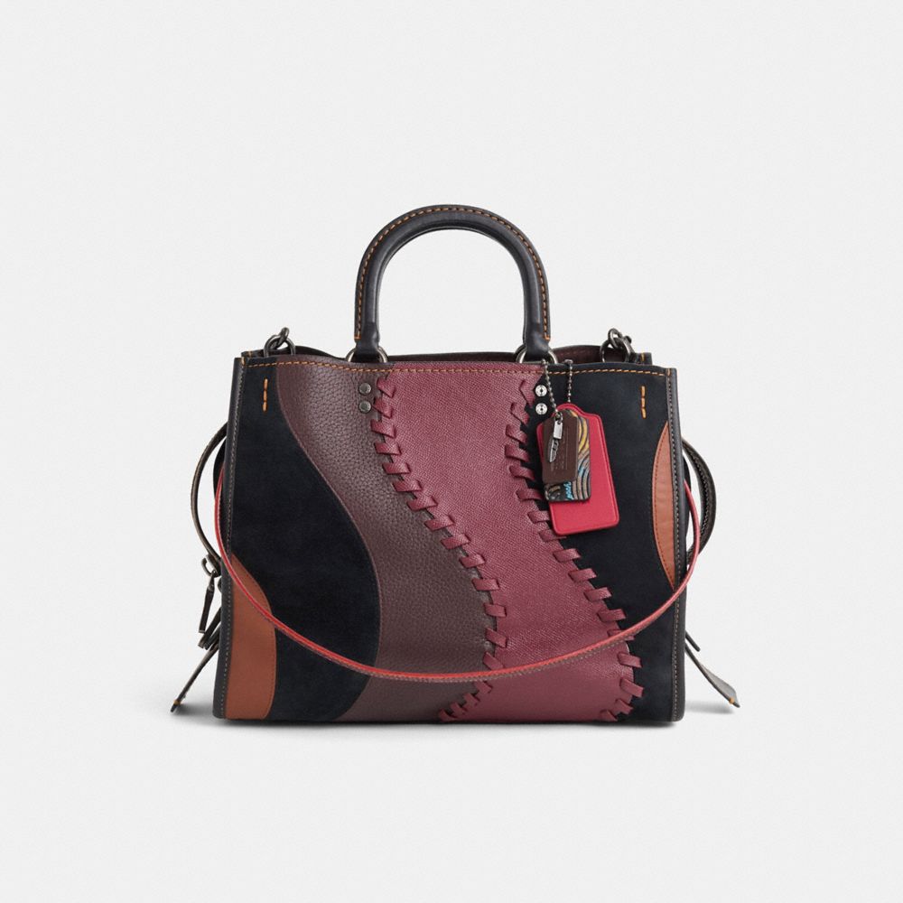 Reimagined by Rose Oliva with a wave of rich burgundy whipstitched for depth and dimension front to back, this mixed media top handle style has been expertly cleaned, conditioned and restored. Our talented craftspeople Fernando Gutierrez, Alfred Deaza and Yngrid Pichardo Baez hand-decorated the front and back with a Coach whipstitched leather remnant panel, replaced tarnished feet and D-rings, then added genuine snakeskin shoulder straps, a long pop leather strap and a playful repurposed charm. Inspired by free spirits, rebels and dreamers, the aptly named Rogue is a go-anywhere bag. It's crafted in a graphic mix of suede, pebble and glovetanned leathers.