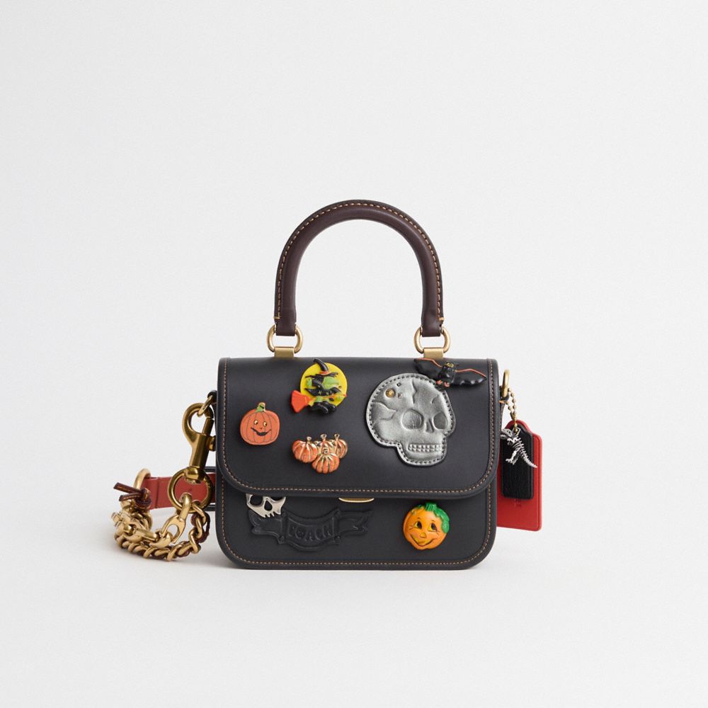 Reimagined with vintage Halloween patches and pins for some wicked-cool fun by Eunice Chang and Rose Oliva, this petite style has been expertly cleaned, conditioned and restored. Our talented craftsperson Nicole Izquierdo hand-decorated the front with a medley of Coach icons and festive embellishments, replaced the chain and long straps, then added a playful repurposed charm. Inspired by free spirits, rebels and dreamers, the aptly named Rogue can be carried by the top handle, worn as a short shoulder bag or crossbody. Perfectly organized with four compartments and a convenient outside slip pocket for easy access to essentials, the versatile colorblock glovetanned leather style secures with a pushlock closure.