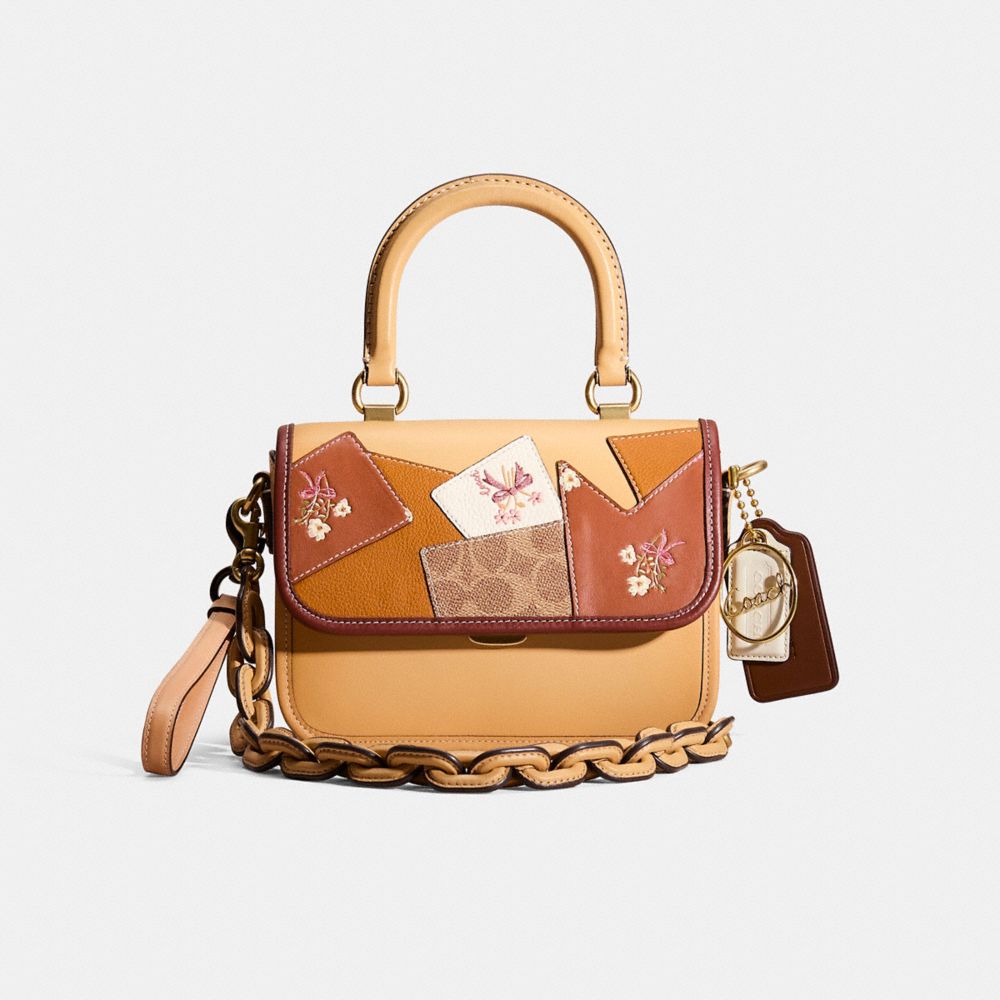 Reimagined by Rose Oliva with a mosaic patchwork of luxe leathers, nostalgic floral patterns and our Signature canvas, this petite style has been expertly cleaned, conditioned and restored. Our talented craftspeople Jose Reyna and Alfred Deaza embellished the flap with a selection of Coach remnant pieces, attached leather edge binding to the flap, refreshed the interior and added a playful repurposed charm. Inspired by free spirits, rebels and dreamers, the aptly named Rogue can be carried by the top handle, worn as a short shoulder bag with the elegant leather covered chain strap or crossbody with the long detachable strap. Perfectly organized with four compartments and a convenient outside slip pocket for easy access to essentials, the versatile glovetanned leather style secures with a pushlock closure.