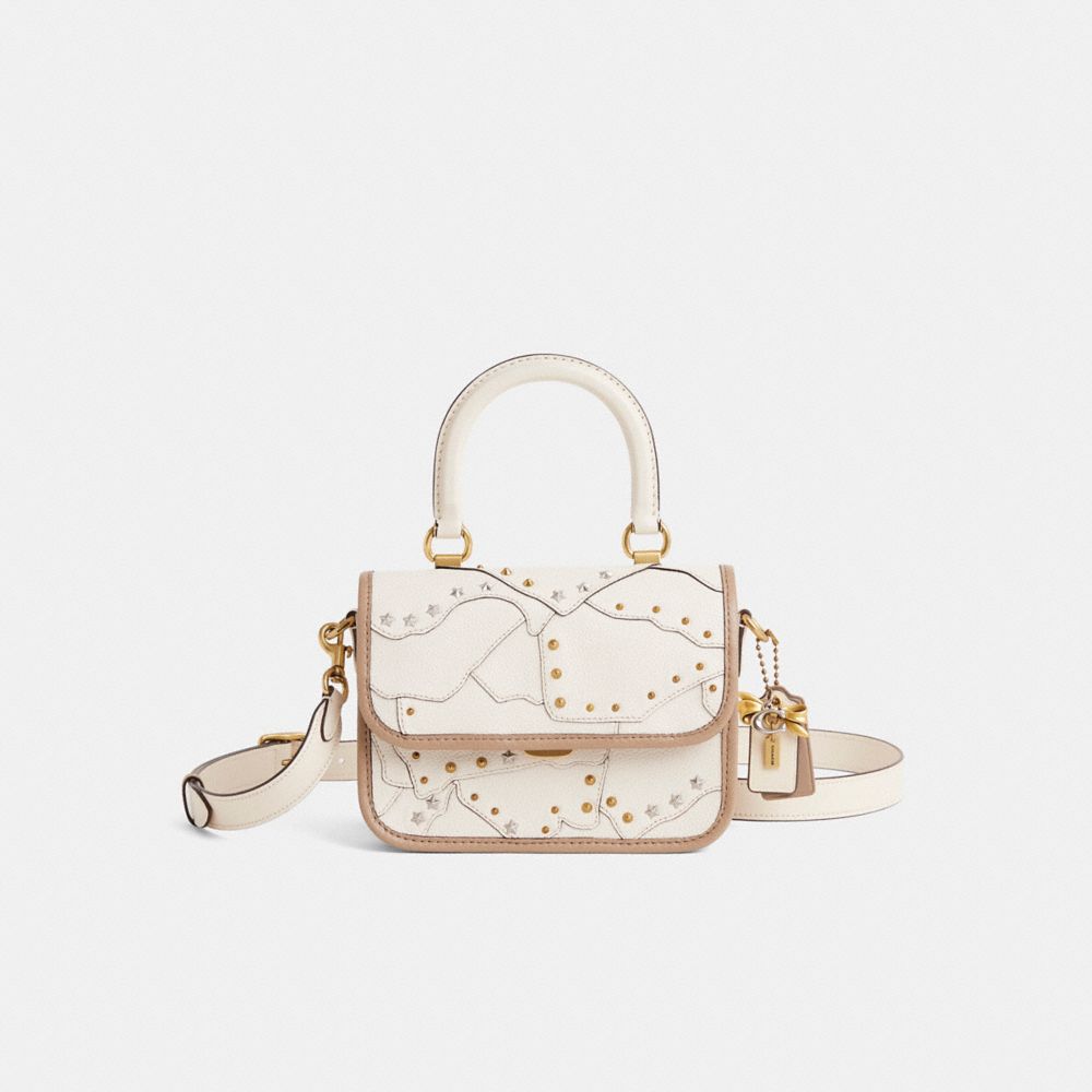 Reimagined with a distinctive raw-edge patchwork by Eunice Chang featuring a mix of multi-shaped studs for a hint of shine, this petite style has been expertly cleaned, conditioned and restored. Our talented craftspeople Jose Reyna, Alfred Deaza and Yngrid Pichardo Baez incorporated Coach remnants to the flap and front, hand-decorated them with mixed-metal rivets, replaced all edge binding and added a playful repurposed charm. Inspired by free spirits, rebels and dreamers, the aptly named glovetanned leather Rogue is a go-anywhere bag. It can be carried by the top handle, worn as a short shoulder bag with the elegant leather covered chain strap or crossbody with the long detachable strap. Perfectly organized with four compartments and a convenient outside slip pocket for easy access to essentials, it secures with a pushlock closure.