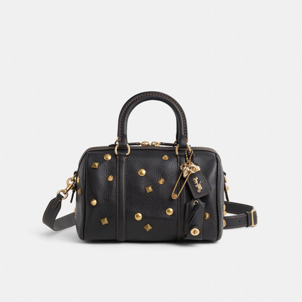 Reimagined by Eunice Chang with an edgy-cool vibe featuring a sprinkling of metallic rivets, this top-handle style has been expertly cleaned, conditioned and restored. Our talented craftsperson Lucas Ortiz hand-decorated the front, back and gussets with mixed metal polished studs, then added a playful repurposed charm. Our Ruby satchel has an iconic rounded shape and an elongated zipper that opens wide for easy access to the spacious interior. Crafted in a mix of natural pebble leather and buttery soft glovetanned leather, its multifunction pockets offer great organization. Carry by the drop-down luggage handles or attach the comfortable wide crossbody strap for hands-free styling.