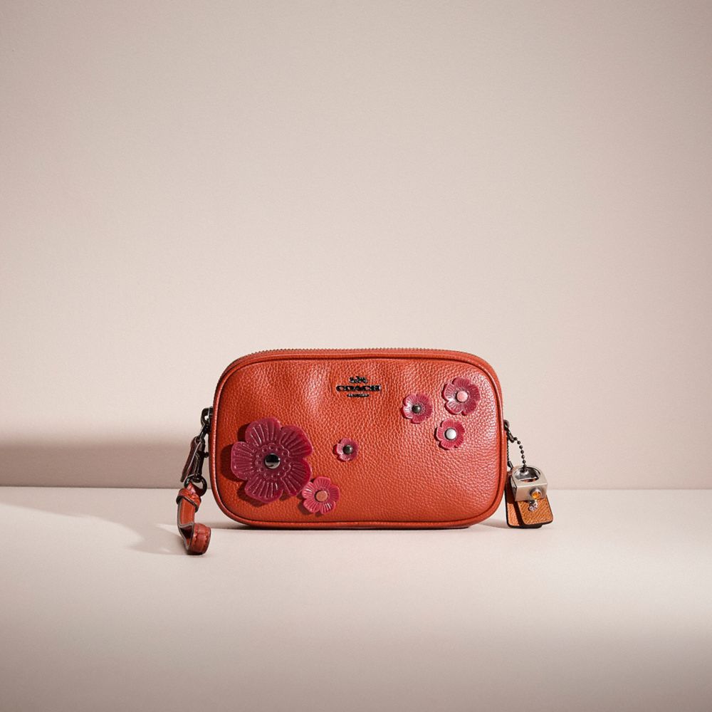 Reimagined by Eunice Chang with an abundance of our nostalgically playful Jelly Tea Rose appliqué in glittery and tonal hues, this zip-top style has been expertly cleaned, conditioned and restored. Our talented craftsperson Adam Perez embellished the front with clusters of rubber blooms, then added a repurposed long strap and playful charm. Charmingly proportioned of soft pebble leather, this lightweight Sadie has just enough space for a phone, cards, keys and other sundries—plus pockets to keep them in place. Its hand-finished leather strap detaches with a click for handheld wear.