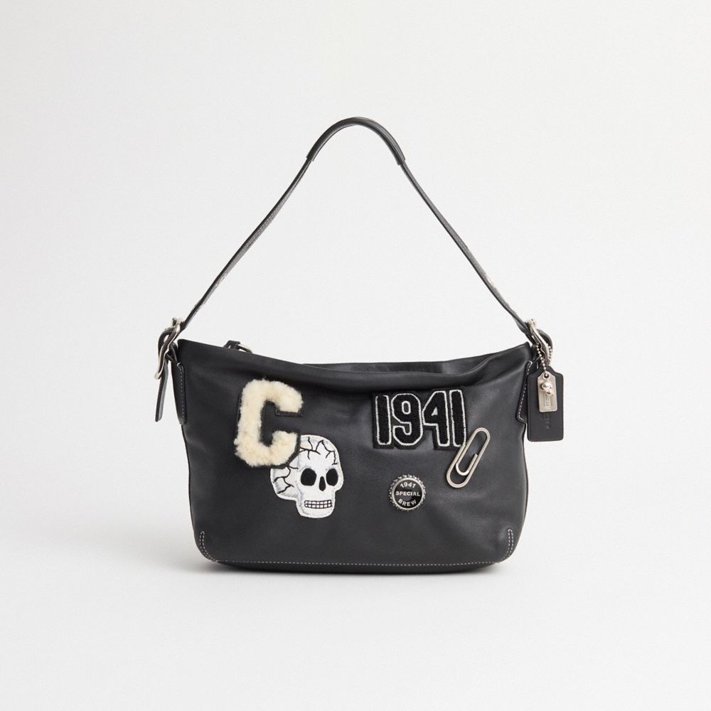 Reimagined with a darkly dramatic Varsity vibe by Eunice Chang featuring a medley of cool Coach patches and pins, this take-everywhere style has been expertly cleaned, conditioned and restored. Our talented craftspeople Nicole Izquierdo and Yngrid Pichardo Baez hand-decorated the front with distinctive embellishments including our founding year, repaired the edgestain and added a playful repurposed charm. Crafted of our buttery soft glovetanned leather, the East-West Duffle features a slouchy silhouette with an adjustable shoulder strap. It's finished with a zip-top to keep your essentials secured.