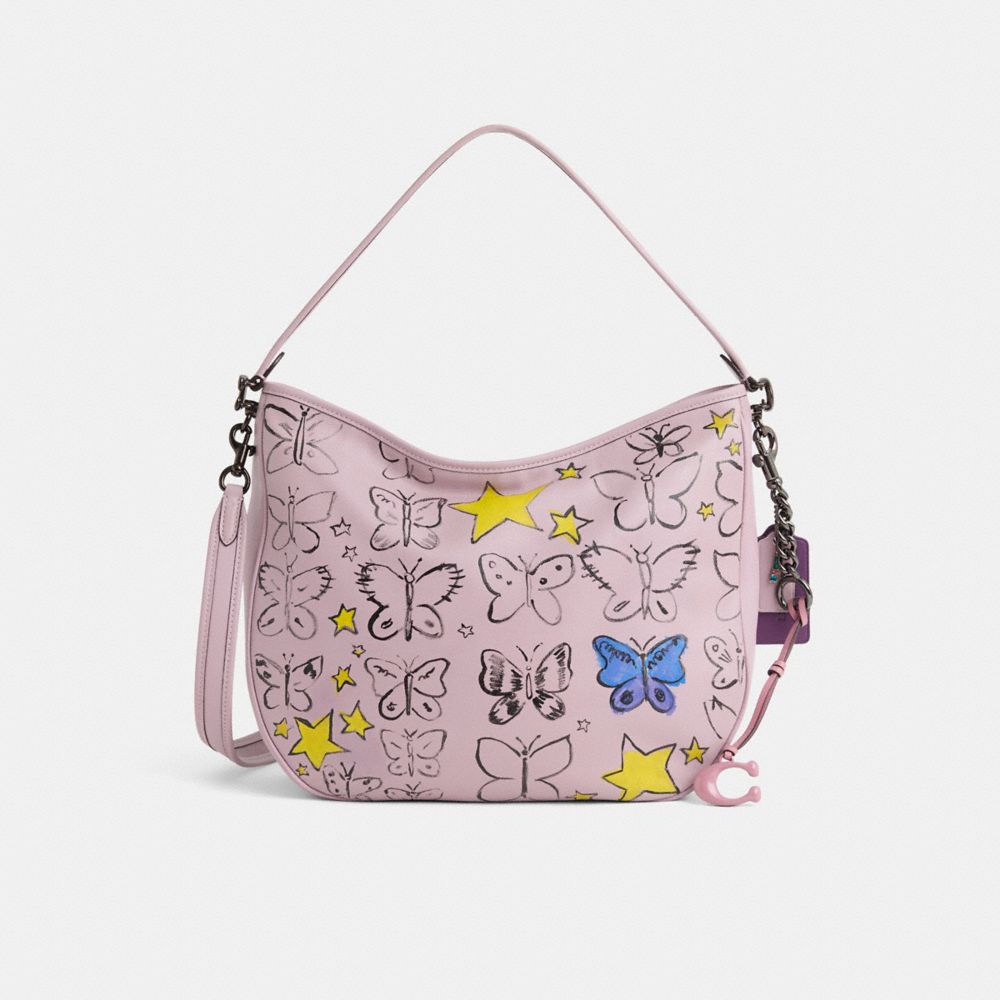Reimagined by Rose Oliva with a whimsical sketch study motif of free-spirited butterflies delicately hand-painted by Sarah Hoffman, this hobo design has been expertly cleaned, conditioned and restored. It's finished with a playful repurposed charm. The Soft Tabby reimagines our structured take on an archival 1970s Coach design with a slouchy relaxed feel. Finished with our Signature hardware at the strap for an iconic touch, this soft smooth leather hobo bag features a secure zip-top, zip pockets inside and out to organize small accessories and a detachable strap to wear crossbody.