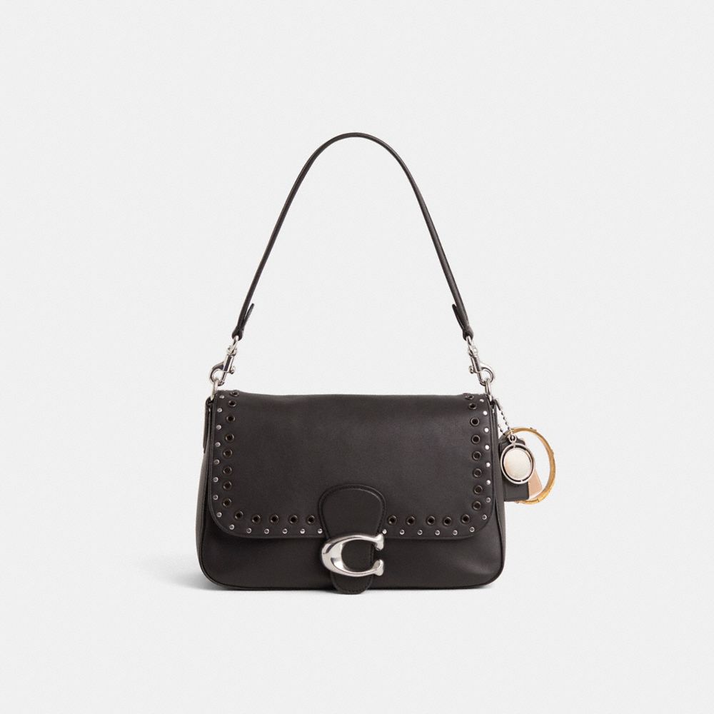 Reimagined with gleaming grommets alongside striking border rivets by Rose Oliva for an industrial-inspired vibe, this flap-front style has been expertly cleaned, conditioned and restored. Our talented craftspeople Alfred Deaza and Jose Reyna applied polished embellishments to the front, spot-painted the lining, refreshed the exterior, repaired the edgestain on flap roll and added a playful repurposed charm. The Soft Tabby reimagines our structured take on an archival 1970s Coach design with a slouchy relaxed feel. Finished with polished rivets and our Signature hardware for an iconic touch, this smooth leather shoulder bag features zip pockets inside and out to organize small accessories and two detachable straps to carry by hand, style as a short shoulder bag or wear crossbody.