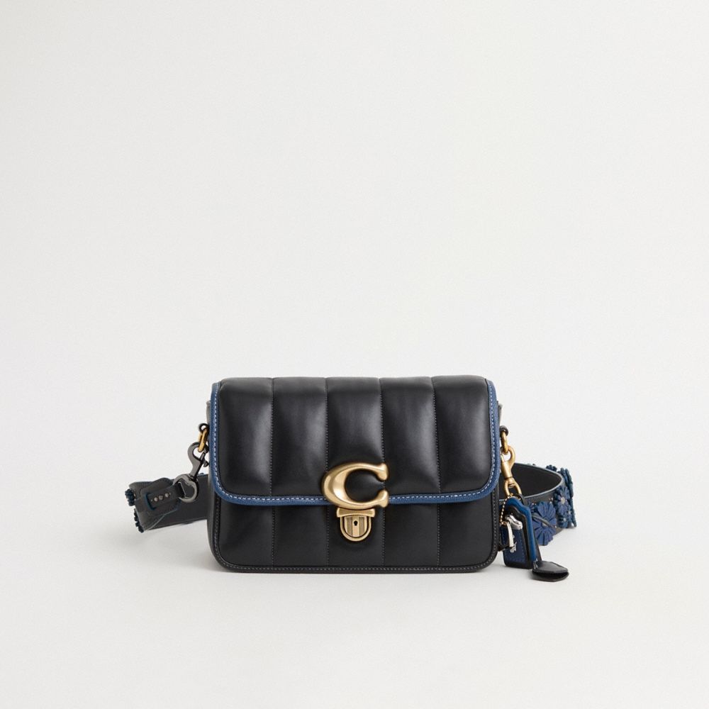 Reimagined by Rose Oliva with a bold pop of color for a high-contrast edge, this quilted style has been expertly cleaned, conditioned and restored. Our talented craftsperson Jose Reyna applied bright blue binding to the flap, attached a long strap embellished with rivets and pop leather flowers in a matching hue, then added a playful repurposed charm. This aptly named bag was dreamed up in the Coach Design Studio. Finished with an archive-inspired Signature push-lock closure, this take-everywhere silhouette is crafted of soft quilted nappa leather with plenty of pockets to keep you organized on the go.