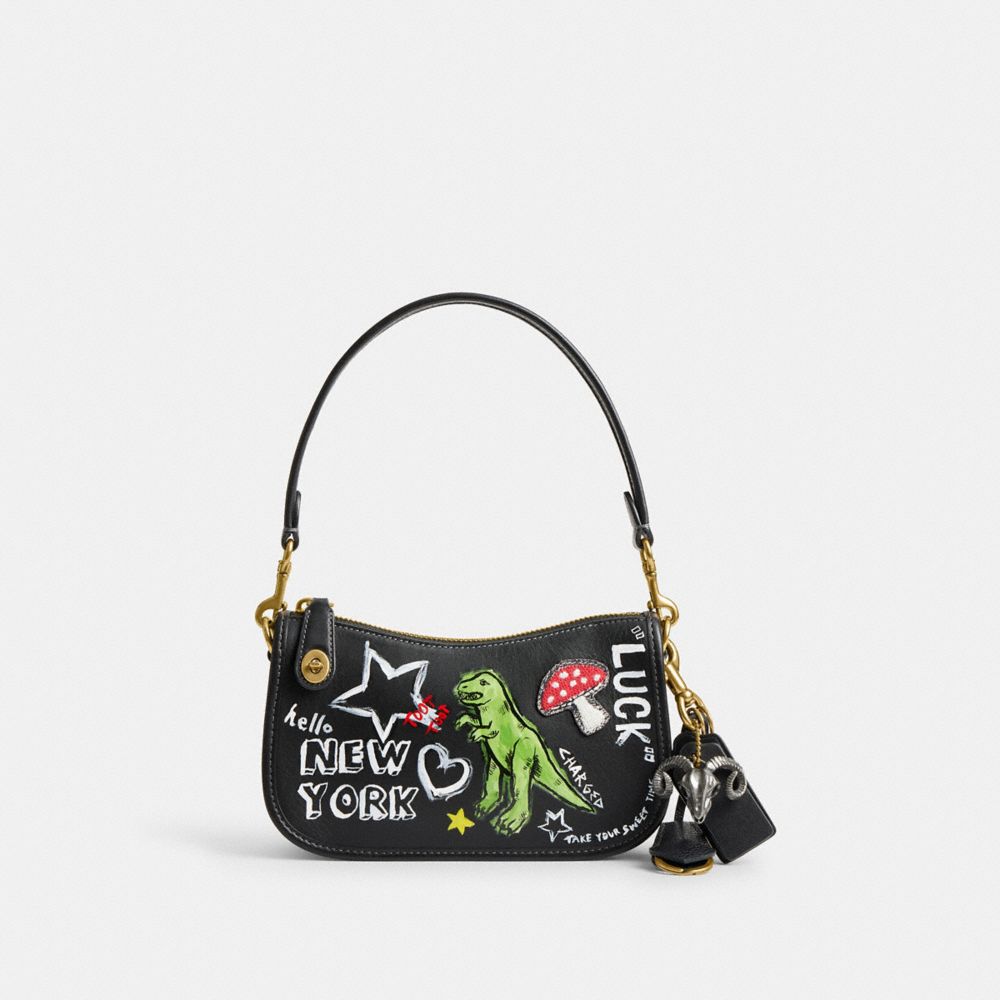 Vibrantly hand-painted by Rose Oliva with an imaginative Coach diary doodle motif inspired by youthful rebellion and the creative expression of artistic notebook scribbling, this short shoulder bag has been expertly cleaned, conditioned and restored. The dynamic artwork mixes a roaming dinosaur, New York snacks, clover, hearts and stars with clever thoughts and phrases. Our talented craftspeople Jose Reyna and Yngrid Pichardo Baez applied a salvaged embroidered mushroom patch to the front, replaced the D-rings and anchors, repaired the turnlock tab and threading on the shoulder strap, then added a playful tonal repurposed charm. Crafted of glovetanned leather, the Swinger 20 is based on a 1980s Coach design and features our iconic turnlock closure. This petite style sits just beneath the underarm with the short-strap or it can be carried as a clutch.