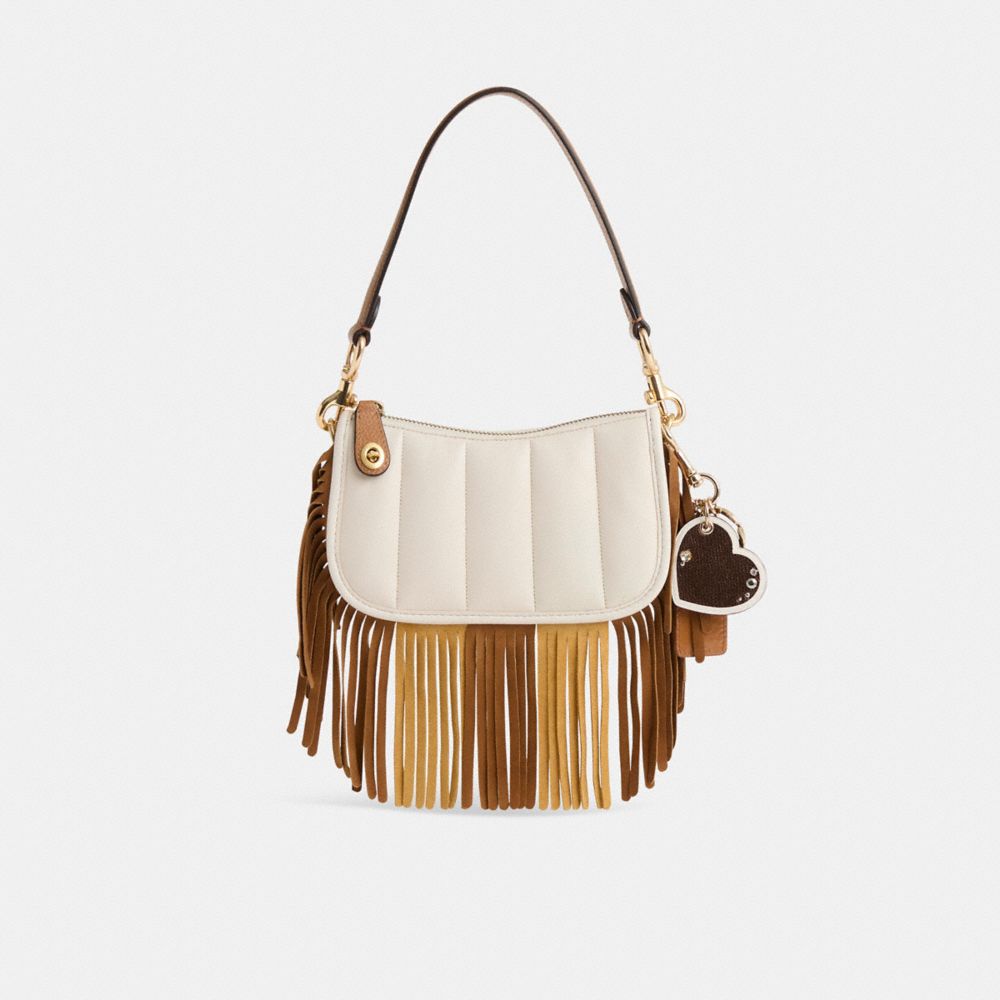 Reimagined with a bohemian-inspired vibe by Savannah Sutton featuring swingy leather fringe in a striped earthy color palette, this streamlined style has been expertly cleaned, conditioned and restored. Our talented craftspeople Nicole Izquierdo and Yngrid Pichardo Baez applied statement-making fringe along the edges, spot-painted the front, then added a pop zipper pull and a playful repurposed charm. The Swinger 20 is part of The Coach Originals, a collection of archival-inspired bags that celebrates our legacy and authentic New York heritage. This quilted nappa leather style is based on a 1980s Coach design reimagined for today. Featuring our iconic turnlock closure, the petite bag sits just beneath the underarm with the short-strap or it can be carried as a clutch.
