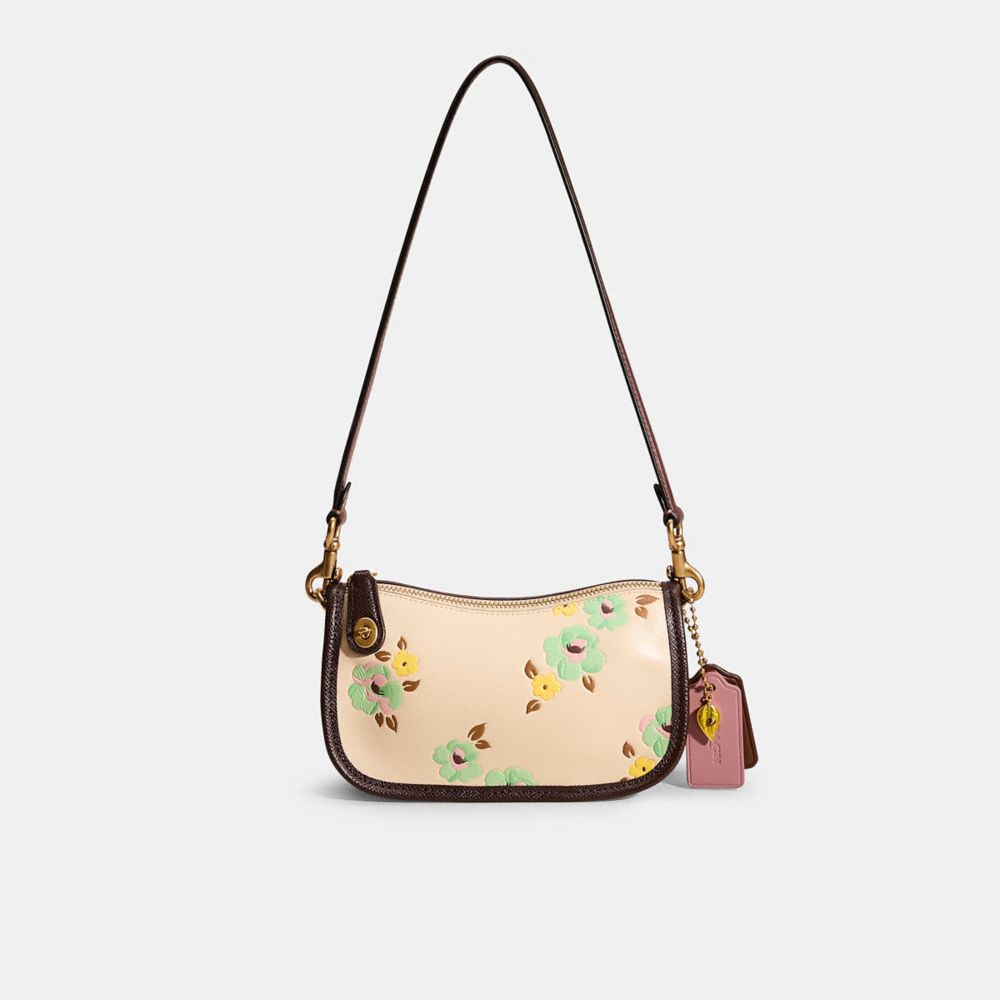 Reimagined with a pop of bold color by Dorothy Finney for a distinctive finishing touch, this streamlined style has been expertly cleaned, conditioned and restored. Our talented craftspeople Jose Reyna, Alfred Deaza and Yngrid Pichardo Baez replaced the binding and turnlock closure with contrasting brown leather, then added a matching brown leather strap and a playful repurposed charm. Detailed with a fresh pastel floral print, this glovetanned leather Swinger 20 is based on a 1980s Coach design reimagined for today. Featuring our iconic turnlock closure, the petite bag sits just beneath the underarm with the short-strap or it can be carried as a clutch.